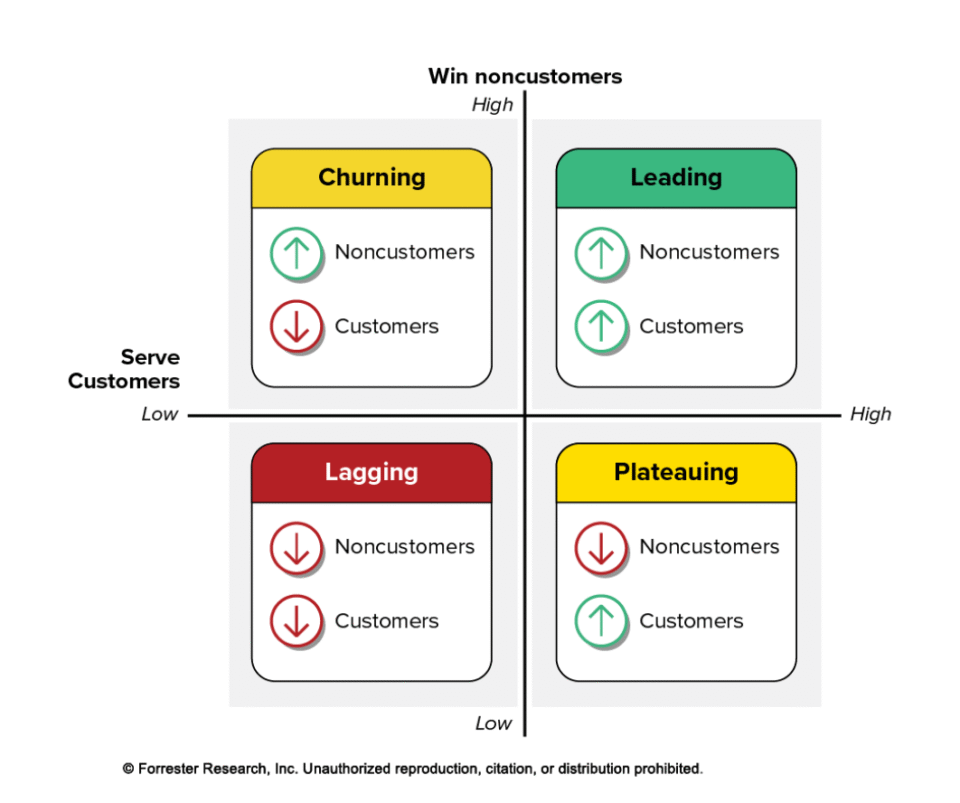 Sercem nowego podejścia Forrester’a jest tzw. Growth Grid – siatka wzrostu, która obrazuje dwie osie działania firmy: zdobywanie klientów (BX) i ich obsługę (CX). Na tej siatce każda marka może zobaczyć, czy skutecznie przyciąga uwagę nowych odbiorców oraz czy potrafi utrzymać lojalność i zadowolenie już pozyskanych klientów. Pozycjonowanie firmy na tej siatce pozwala nie tylko zdiagnozować problemy, ale również wskazuje konkretne obszary do poprawy. Dzięki temu Total Experience Score staje się nie tylko wskaźnikiem, ale także narzędziem do podejmowania strategicznych decyzji biznesowych.