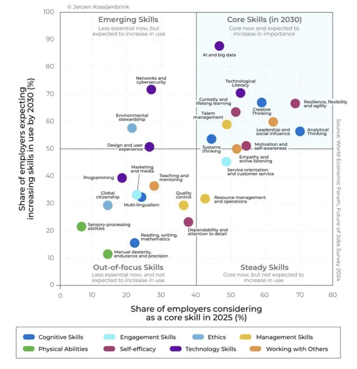 Analiza kwadrantu „Core Skills”, obejmującego umiejętności o wysokim znaczeniu obecnie i prognozowanym wzroście do 2030 roku, wskazuje na interesujący trend. Oprócz oczywistej konieczności biegłości cyfrowej („Technology Literacy”), pracodawcy coraz wyżej wyceniają kompetencje leżące na styku analityki i inteligencji emocjonalnej. Najszybciej rosnące zapotrzebowanie dotyczy myślenia systemowego, kreatywności oraz odporności psychicznej (resilience). Dla liderów Customer Care jest to wyraźny sygnał: przyszłość obsługi nie należy do pracowników znających jedynie narzędzia, ale do tych, którzy potrafią łączyć myślenie analityczne z empatią i aktywnym słuchaniem.